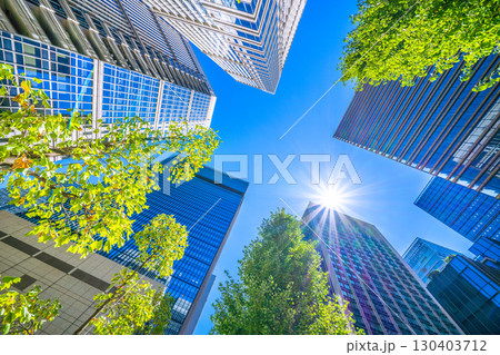 日本の東京都市景観 新緑と光芒…「大手町駅前」の交差点からのオフィスビル群を望む。新時代に希望の光