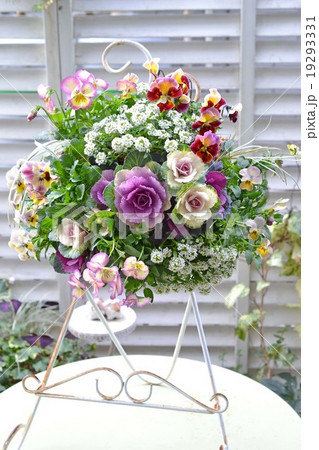 ガーデンテーブルに置かれたハボタンの寄せ植え