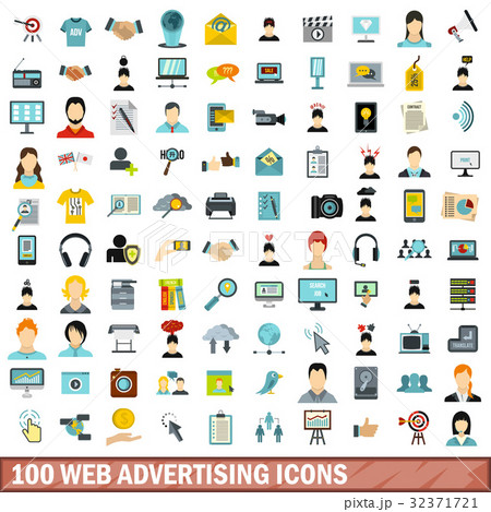 100 web advertising icons set, flat style