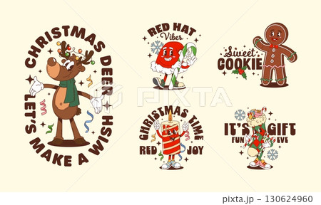 Funny Christmas groovy characters stickers and t shirt prints for winter holiday, vector. Groovy stickers with cartoon snowman and Santa gifts, magic elf and mulled wine with Christmas greeting quotes