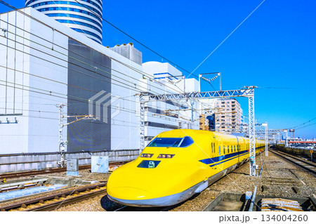 日本の横浜都市景観新横浜駅にさしかかるドクターイエロー。直線ラインに入り美しいフォルムが鮮明に…