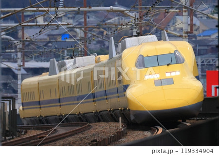 日本の横浜都市景観新横浜駅にさしかかるドクターイエロー。直線ラインに入り美しいフォルムが鮮明に…