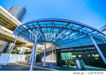 日本の東京都市景観 朝の横浜駅前や横浜市営地下鉄ブルーライン横浜駅出入口を望む