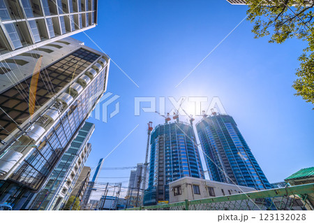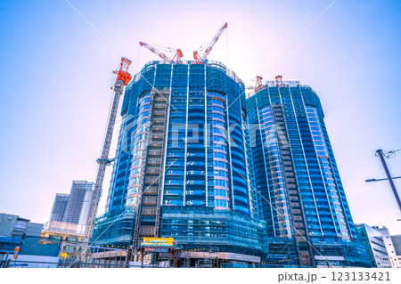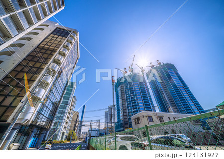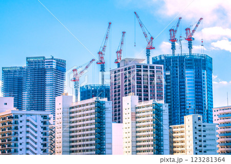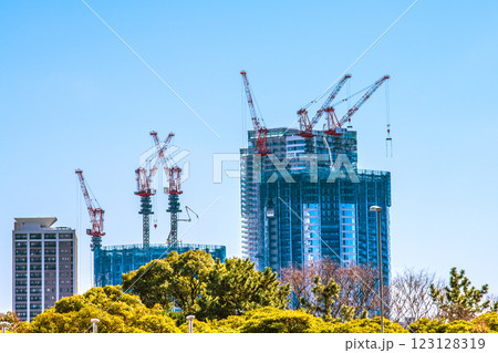 日本の東京都市景観 建設中の豊海地区・タワーマンションなどを望む