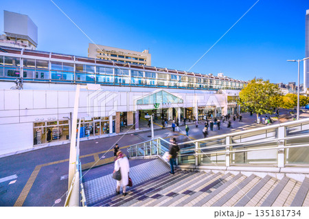 日本の横浜都市景観 桜木町駅や防犯カメラ、喫煙禁止地区、電車、窓に映る大観覧車とパシフィコなどを望む