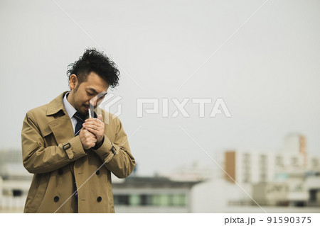 Young man smoking cigarette on the street. Portrait of handsome guy smoking outdoors