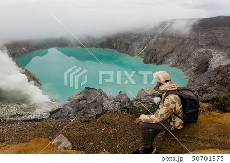 Man tourist looks at the sulphur lake on the Ijen volcano on the island Java in Indonesia. Hiker man