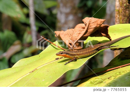 葉っぱの上で日光浴するCommon Sun Skink(タテスジマブヤ)