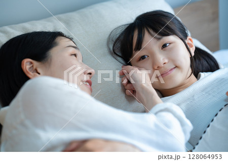 起きない小学生の女の子とお母さん