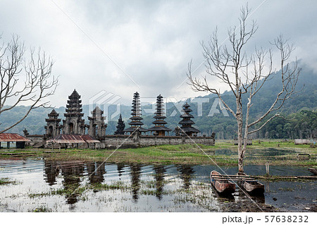 Old historic temple at Tamblingan Lake in cloudy day in Bali of Indonesia.