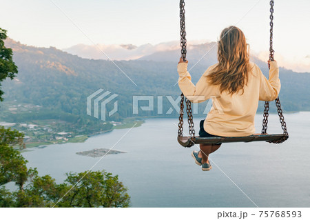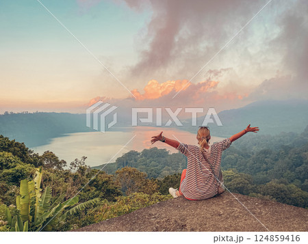 Woman watching the beautiful sunset from view point over Lake Buyan