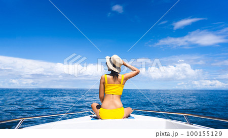 Young adult traveling woman sit on the sailing boat with summe blue sky and sea