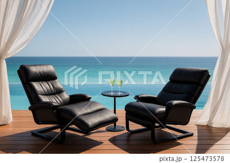 インフィニティプール付き高級デッキでくつろぐ黒のレザーチェアとシャンパン
