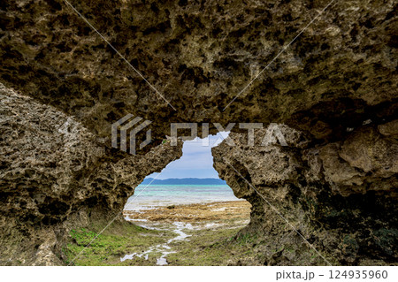 自然が作り出した岩のトンネルから望む、石垣島のエメラルドグリーンの海