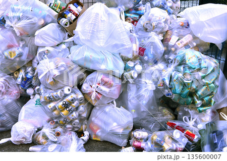 日本の横浜都市景観山積み…街角のゴミ置き場。缶や瓶、ペットボトルなどの回収日…同一銘柄を飲まれる方も