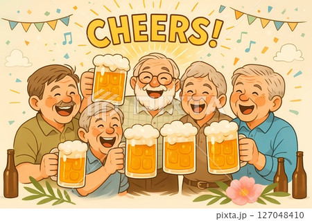 ビアガーデンで楽しそうにビールで乾杯する中年男性たち