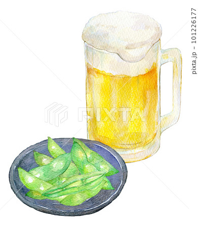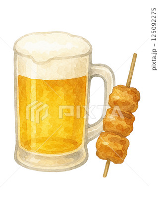 ビールと焼き鳥の水彩イラスト/居酒屋メニュー/ビールとおつまみセット