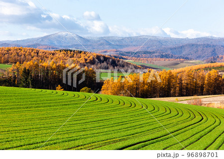 【美瑛町 四季彩の丘から秋の風景と十勝岳連峰】