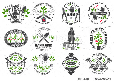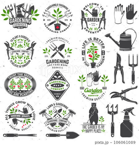 Set of gardening and yard work services emblem, label, badge, logo. Vector. For sign, patch, shirt design with hand garden trowel, farming fork, sprayer, tomato bush in pot, hand secateurs, pruner