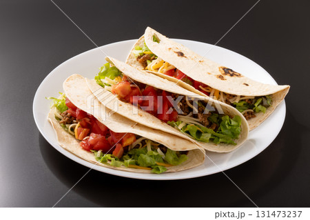 トルティーヤ、タコス、タコ、メキシコ料理。牛肉とサルサソースの野菜巻き、アボカド入り。