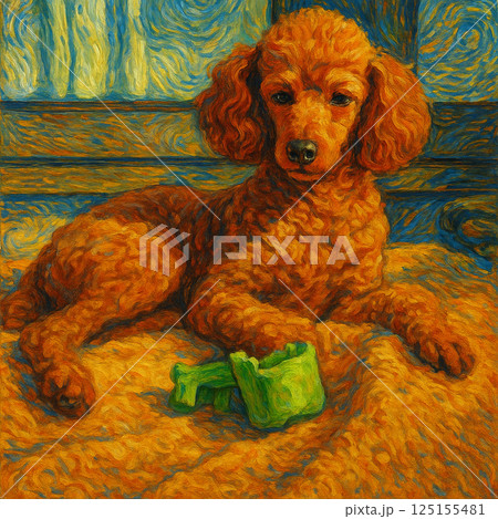 レインコートを着てるかわいいトイプードルの子犬のイラスト