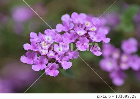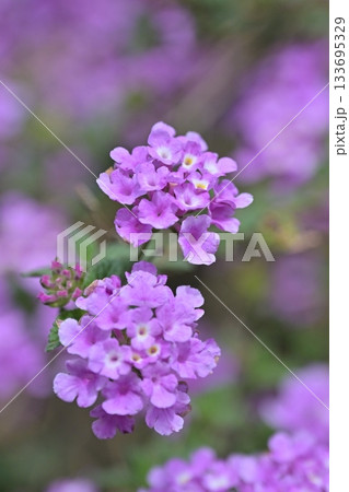 Close up of Trailing lantana in bokeh effect. Wild purple flowers. Flower and plant.