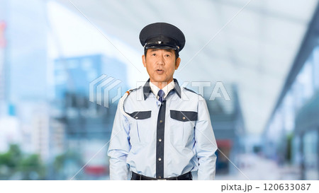 都市の駅前で話をする男性警備員