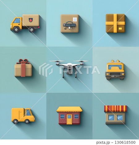 Flat design of delivery icons: truck, drone, package, warehouse