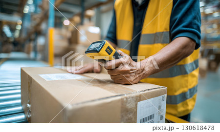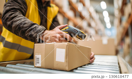 Realistic image of worker scanning barcode on parcel in warehouse