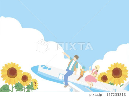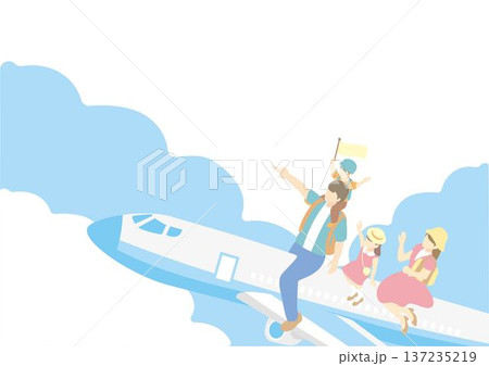 青空と飛行機に乗る家族のアイソメトリックイラスト。旅行・レジャーのバナー背景やフレーム素材