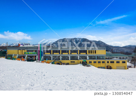 青空のスキー場レストランと目の前に広がるゲレンデ (長野県、白馬、栂池高原)