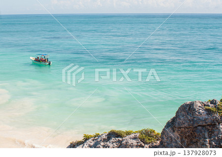 People vacationing on a small boat along the bright turquoise waters of the Caribbean Sea near Tulum, Mexico, enjoying a sunny day on a tropical beach holiday