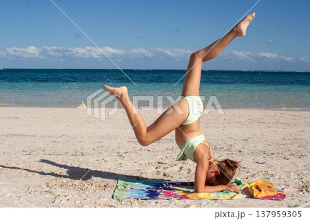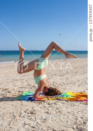 Young girl practices a headstand yoga pose on a striped towel on a sandy beach during summer vacation, enjoying healthy outdoor activities and mental balance