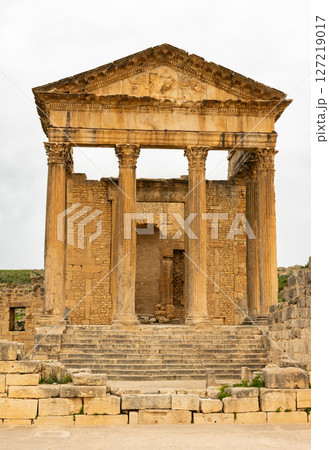 Ruins of ancient Roman capitol on territory of antic city of Dougga in area of modern Tunisia.