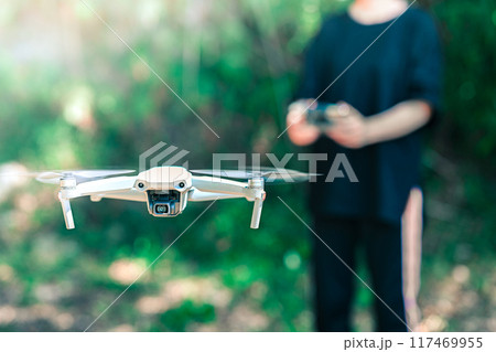 晴れた屋外でドローン撮影を楽しむ若い男性