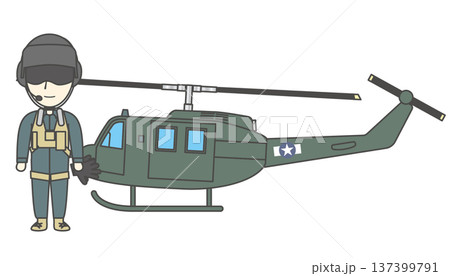 米軍ヘリコプター・イロコイと搭乗員のイラストセット(UH-1・軍事・パイロット・兵士)