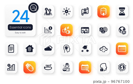 Outline set of Architectural plan, Freezing and Chemistry lab line icons for web app. Include Nurse, Stress grows, Time management pictogram icons. Qr code, Fluorine mineral, Timer signs. Vector