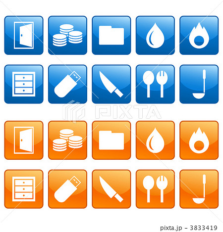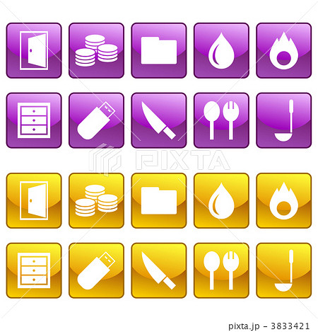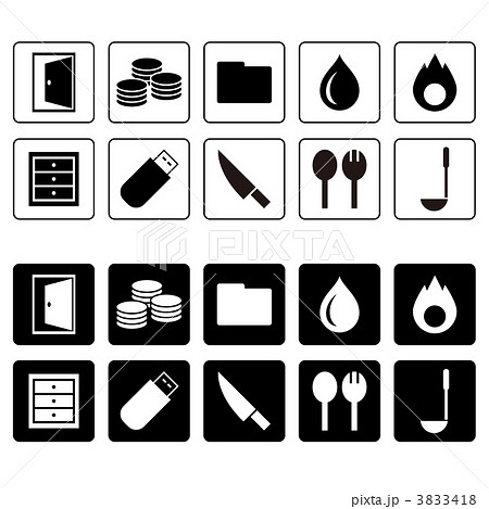 扉、コイン、水滴、炎、引き出しなどのアイコンセット