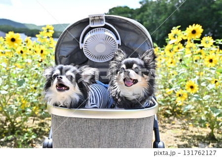 満開のひまわり畑と2匹の仲良しチワワ (犬用カートに扇風機を付けて暑さ対策)