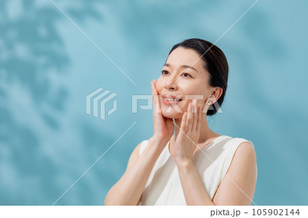 日差しが差し込むブルーバックでスキンケアをする若い女性