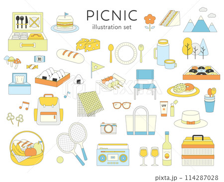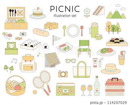 ピクニック イラスト セット ライン 線画 行楽 アウトドア レクリエーション お弁当 ハイキング