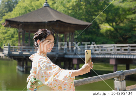 観光地でスマホ自撮りする着物女性