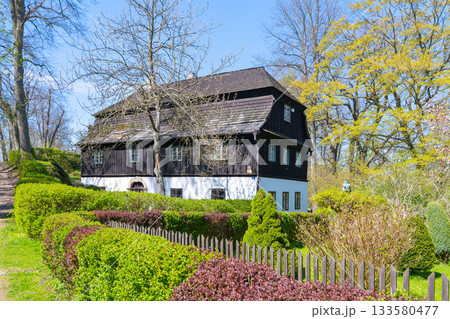 Traditional half-timbered house in rural village of Lusatian Mountains, Czech Republic