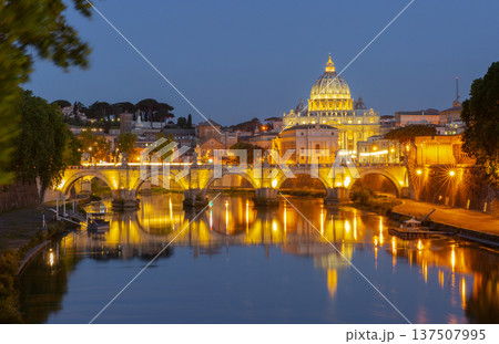 Evening view of St. Peter's Basilica and illuminated bridge over the Tiber River in Rome