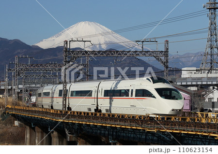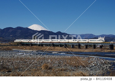 酒匂川橋梁を渡る小田急ロマンスカーと冠雪の富士