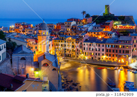 Vernazza village illuminated in the night, Cinque Terre, Liguria, Italy
