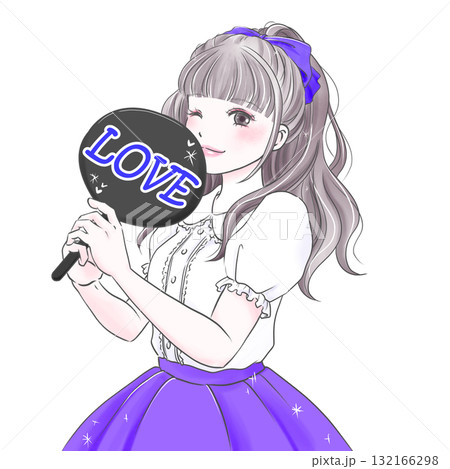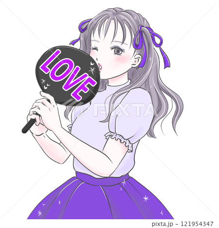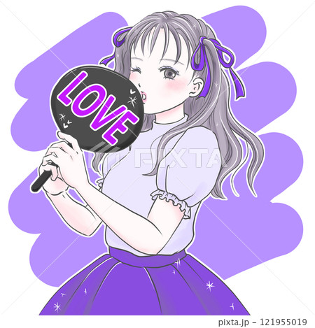 LOVEのうちわを持って推し活を楽しむ若い女性パープル