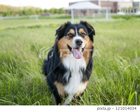 USA, Virginia, Blacksburg, Black Tri Australian Shepherd sitting in grassy field