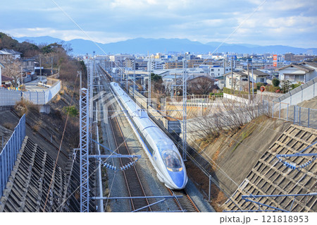 福岡市を背景に東へと進む500系新幹線(JR西日本)