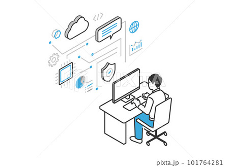 AIチャットサービスを利用して仕事をする男性のイメージイラスト素材